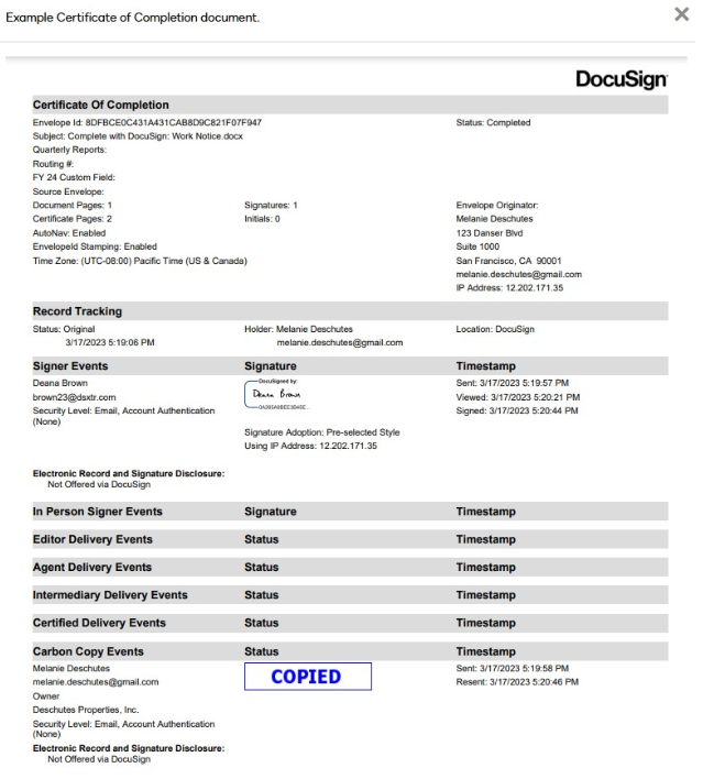 Every document sent through DocuSign generates a Certificate of Completion, a detailed, tamper-evident record of every action taken, including timestamps, IP addresses, signer identities, and authentication methods. It’s built to satisfy the scrutiny of legal teams and regulators.