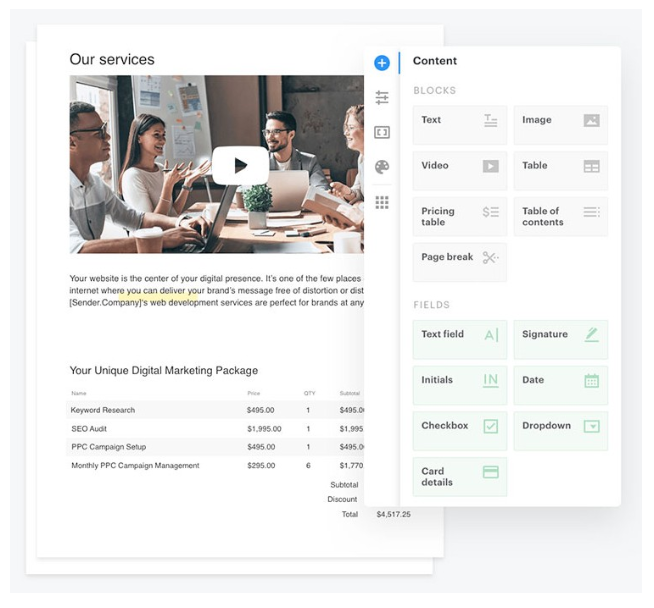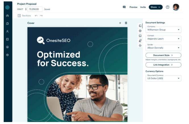 - Best-in-class proposal creation with smart pricing tables and a drag-and-drop editor
