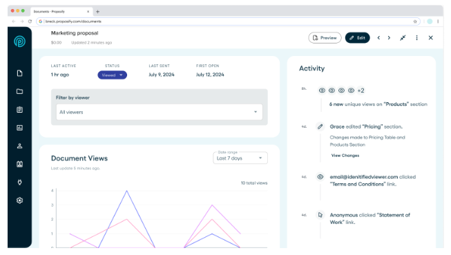 - Real-time engagement tracking shows exactly when prospects view proposals